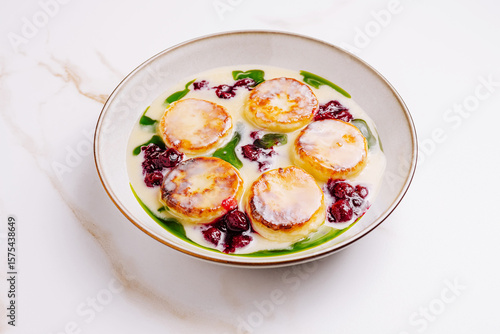 Fototapeta premium Creamy dessert with pancakes, berry sauce, and green garnish