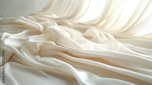Fototapeta premium Creamy drapes billow in sunlight streaming through window