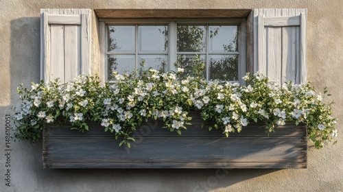 Naklejka premium Creamy flowers in a rustic wooden window box