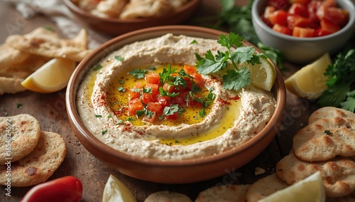 Naklejka premium Creamy Hummus Beiruti with pita bread, lemon wedges, and vegetables