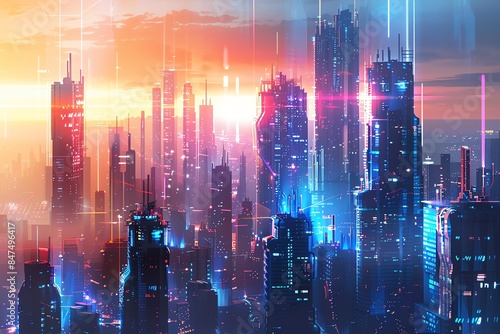 © Janthiwa, Fototapeta premium Create a digital painting of a cyberpunk city