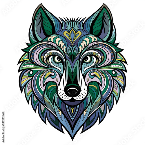 Obraz premium Create a highly detailed and colorful mandala-style wolf head with intricate patterns and symmetrical design.