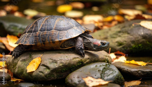 © LIGHTFIELD STUDIOS, Fototapeta premium Create a layered image of a turtle sunbathing on a rock, surrounded by colorful autumn foliage.