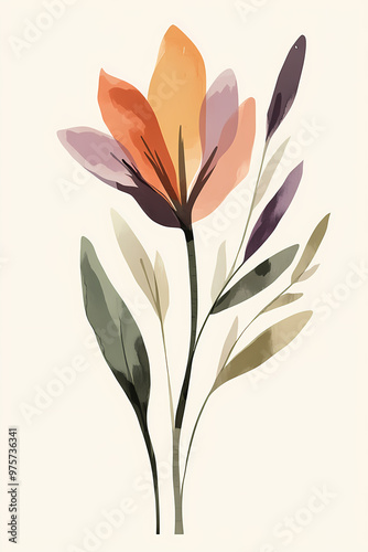 Naklejka premium Create a mid-century modern art piece that showcases a stylized lavender flower representing Lisbon The design should use warm earthy tones with muted pinks oranges and greens featuring simple flat
