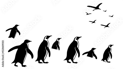 Naklejka premium "Create a modern art print with twelve graphic black silhouettes of penguins...