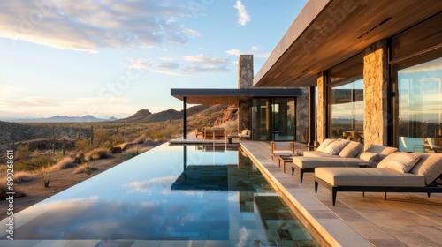 © Chayna, Obraz premium Create a prompt for a photo realistic image of a luxury desert retreat featuring earth tones, infinity pool, and desert landscaping