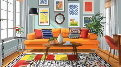 Fototapeta premium Create a sketch of a vibrant living room with a colorful sofa, a bold coffee...