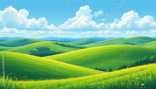 Fototapeta premium create a vibrant and picturesque summer scene featuring rolling hills covered with lush green grass under a blue sky dotted with fluffy white clouds