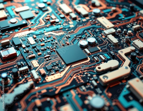 © Vi, Obraz premium create an abstract futuristic image featuring a construction circuit board in a 3d rendering, the background should have a technology theme, with a clear, sparkling teal tone