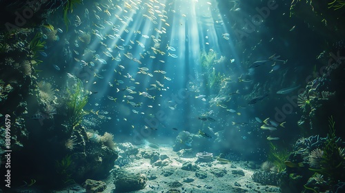Fototapeta premium Create an image of an underwater world entwined with psychological elements, using unique lighting techniques to evoke mystery and wonder