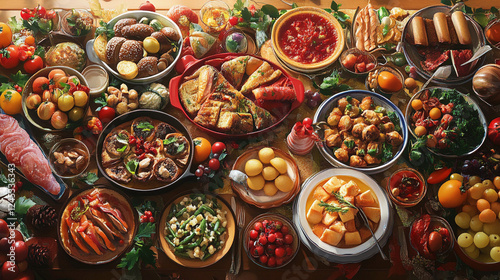 Fototapeta premium Create an image that celebrates the national food of a specific country's in a table, a beautifully arranged spread of traditional dishes, celebrating the richness of global flavors.