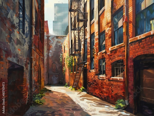 Fototapeta premium Create an oil painting-style panoramic artwork of a quiet urban alleyway