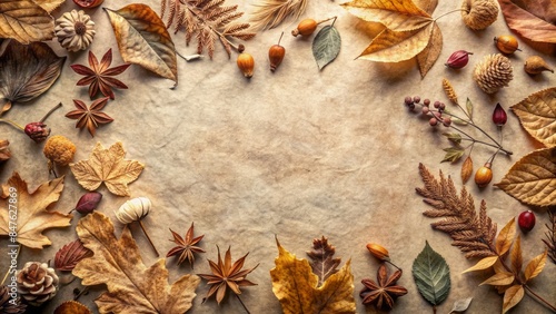 Fototapeta premium Create serene top-view paper dried foliage textured background ample text...