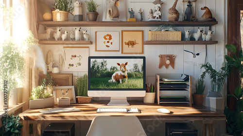 Fototapeta premium Creating a Delightfully Whimsical Workspace with Mock Farm Animals on a Decorated Computer Desk