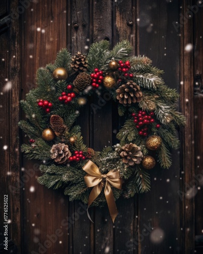 Fototapeta premium Creating a festive atmosphere with a christmas wreath on a rustic wooden front door showcasing red berries pine cones golden ribbons and evergreen foliage