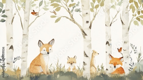 Fototapeta premium Creating a handpainted woodland scene featuring birch trees in a tranquil...