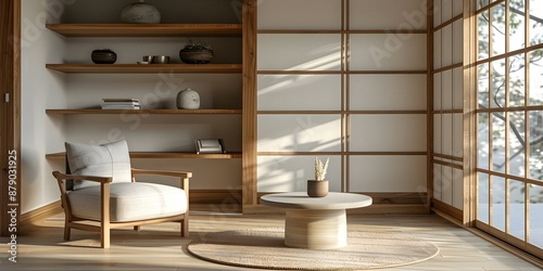 Fototapeta premium Creating a Simple Japandi Living Room with Wooden Shelves, Armchair, and...