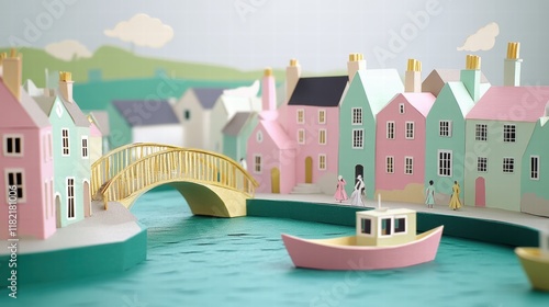 Fototapeta premium Creating Paper Craft Art Mint-Colored Riverside Town with Charming Buildings and Boats