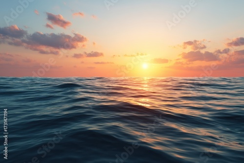 © Sufee, Obraz premium Creation Origin Symbolic concept. Serene ocean waves reflecting a colorful sunset sky.