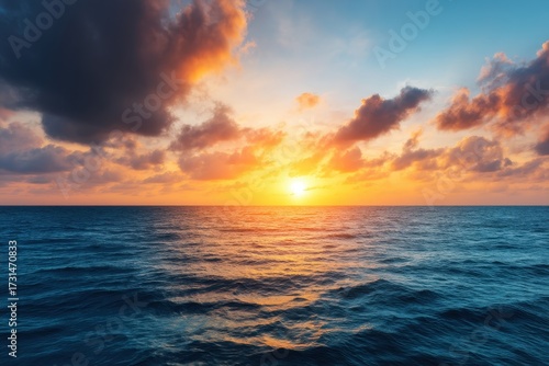 © Sufee, Fototapeta premium Creation Origin Symbolic concept. Vibrant sunset over tranquil ocean waters with dramatic clouds.