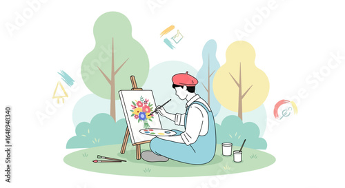 Fototapeta premium Creative Artist Painting Flowers Outdoors With Brush And Easel In Nature Scene