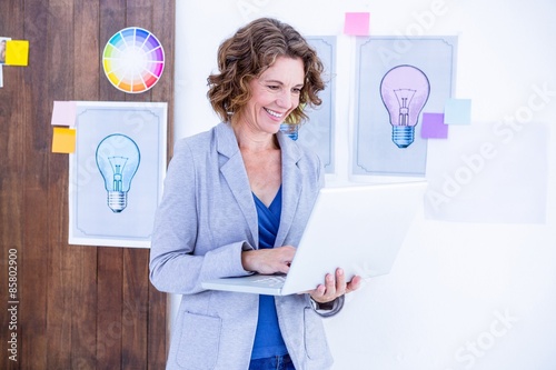 © WavebreakmediaMicro, Fototapeta premium Creative businesswoman holding laptop computer