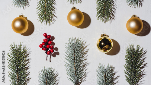 © Designbrisa, Obraz premium Creative Christmas Flat Lay with Pine Branches Gold Baubles and Red Berries on White
