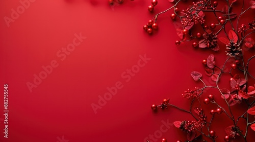 © Johannes, Fototapeta premium Creative christmas framei on red background. Xmas and New Year holiday, banner, postcard, invitation, celebration. Flat lay, top view