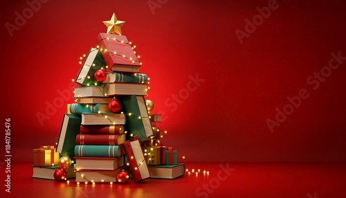 © Design Stock, Naklejka premium Creative christmas tree constructed from stacked books adorned with festive lights and ornaments on a vibrant red background