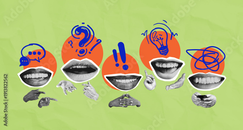 Fototapeta premium Creative communication concept with expressive mouths, hands, and icons on...
