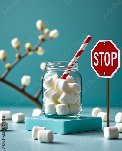 © Imagine , Fototapeta premium Creative conceptual image with marshmallows in a glass jar, striped straws, and a stop sign, symbolizing sugar consumption, diet, restrictions, and health awareness on a pastel background