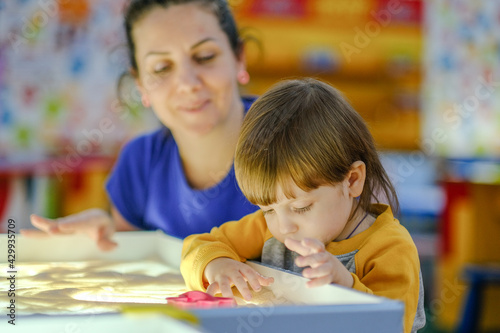 © sergo321, Fototapeta premium Creative early baby development. A mother teaches her child to draw with her fingers in the sand. Center for the Development of Children with Autism.