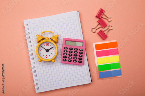 Obraz premium Creative flat lay. Back to school - school supplies on pink background.