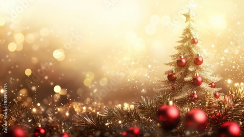 © Johannes, Fototapeta premium Creative gold christmas tree with red balls and glitter on blurred, sparkling lights background. Festive mockup banner with baubles decoration and copy space.