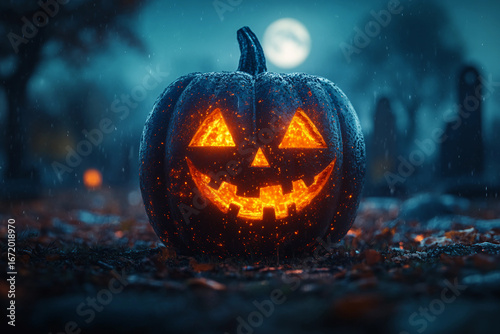© Tetiana, Naklejka premium Creative halloween banner with traditional symbols orange pumpkin wizard hat black cat jack o lanterns, Generative AI