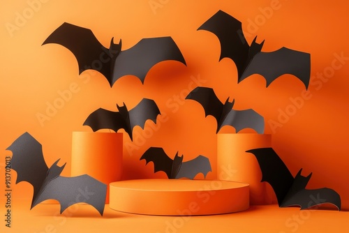 © MUdaylah, Fototapeta premium Creative Halloween composition with paper bats, podium and orange background. Suitable for Product Display and Business Concept with generative ai