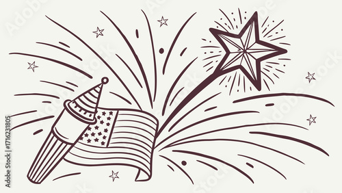 © Badal Ahmed, Obraz premium Creative Hand Drawn Firework Starburst Vector – Crayon Doodle Sparkle, Pencil Brush Light Burst and Festive Party Sky Illustration.