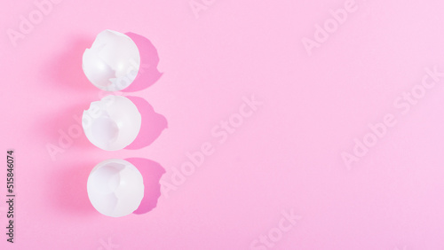 © Hryhor Denys, Fototapeta premium Creative happy easter, food card, egg white shell on a pink background.