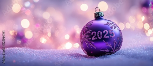 © Sarawut, Fototapeta premium Creative holiday-themed "2025" design featuring a purple ornament as the zero, with a gradient backdrop and text space available.