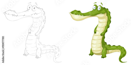 Naklejka premium Creative Illustration and Innovative Art: Animal Set: Sketch Line Art and Coloring Book: Green Crocodile. Realistic Fantastic Cartoon Style Character Design, Wallpaper, Story Background, Card Design