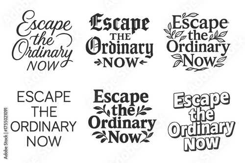Fototapeta premium Creative Lettering Styles. Escape the Ordinary Now. Set lettering. harmonious lettering variations of the same emblematic concept, each with different artistic