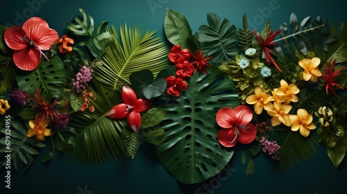Fototapeta premium Creative nature layout made of tropical leaves and flowers. Flat lay. Summer concept.