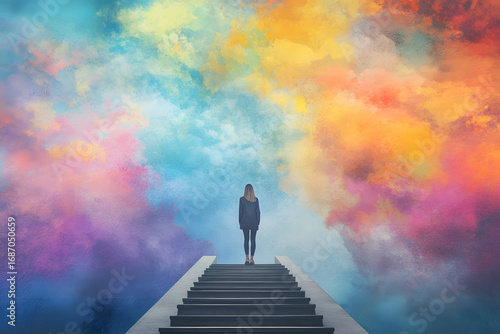 Fototapeta premium Creative representation of an individual stepping from a grayscale world into a vibrant - colorful dream world blue background