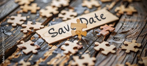 Naklejka premium Creative Save the Date Puzzle Invitation on Rustic Wooden Table for Unique Wedding Announcements