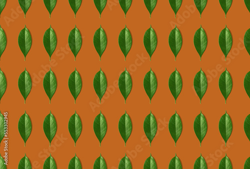 © LanaUst, Fototapeta premium Creative seamless pattern of green leaves on orange background. Creative design in flat lay style. Top view. Mock-up.