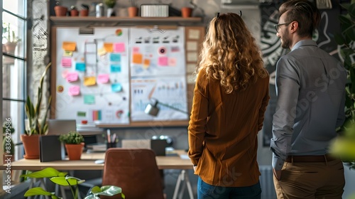 © Tamara, Naklejka premium Creative Team Brainstorming With Sticky Notes on Glass Wall in Modern Office