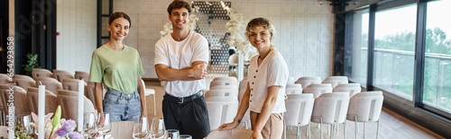 Fototapeta premium creative team of decorators smiling at camera near festive table in celebration hall, banner