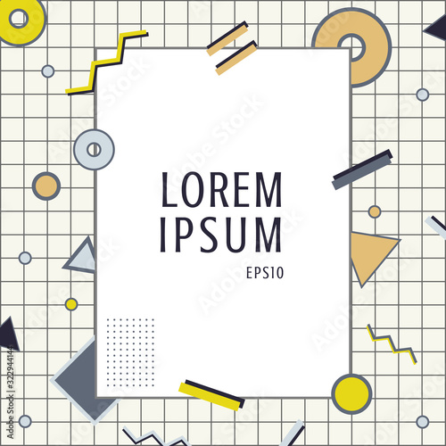 © phochi, Fototapeta premium Creative template rectangle frame border yellow, gray and black geometric circle, triangle, line on grid background memphis style.