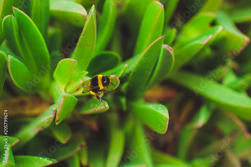 Fototapeta premium Creative tropical succulent green plants and leaves with a bee layout. Nature...