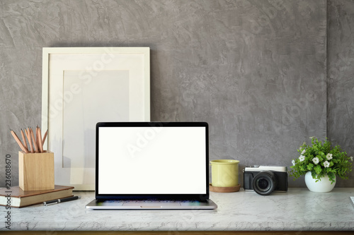 Obraz premium Creative workspace, blank screen laptop, Mockup poster and vintage camera on...